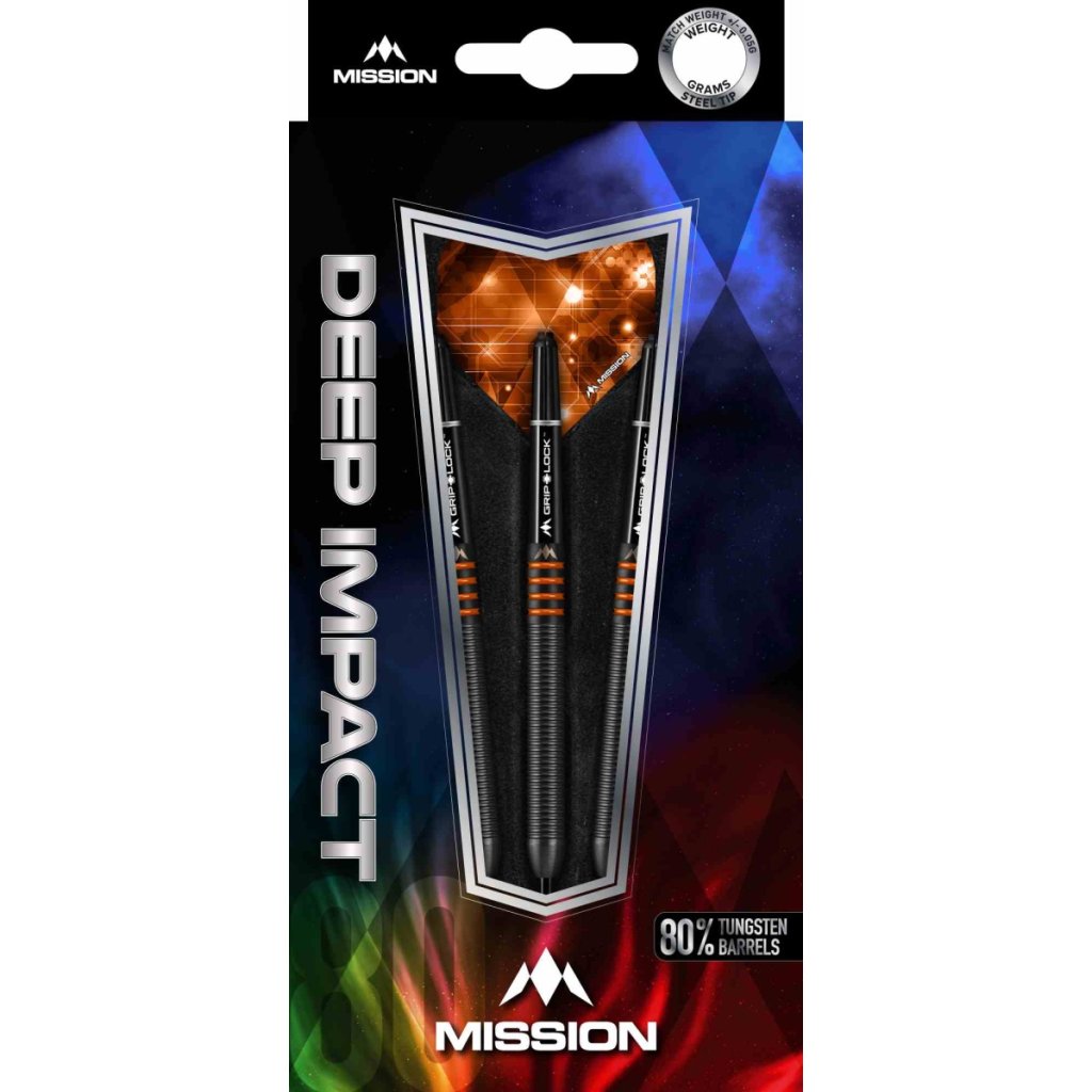 Ocelové šipky Deep Impact jsou vyrobeny z vysoce kvalitního wolframu s moderním černým designem. Těla šipek jsou drážkovaná a pokrytá černým nitridem titanu s oranžovými proužky.